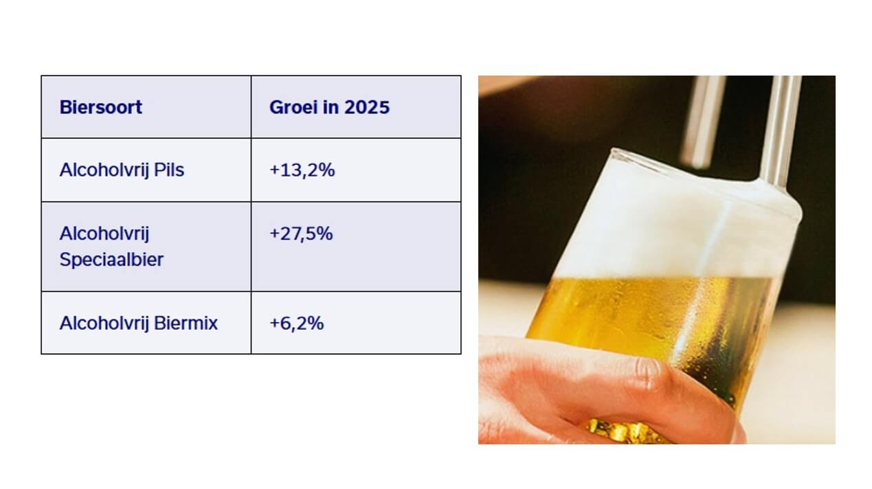 De totale verkoop van alcoholvrij en -arm bier is in 2025 fors gegroeid met 14 procent. Binnen alcoholvrij bier is alcoholvrij pilsbier verreweg het grootste segment, met 42,5%. De verkoop van dit segment is in 2025 met 13,2% gegroeid. Het segment alcoholvrij speciaalbier, goed voor ruim 25% van het totaal, is met 27,5% gegroeid. Hieronder vallen de alcoholvrije varianten van weizen, blond, IPA, en dergelijke. Het segment van alcoholvrije biermix (ongeveer een derde van het totaal) zoals alcoholvrije radlers, groeide met 6,2%.